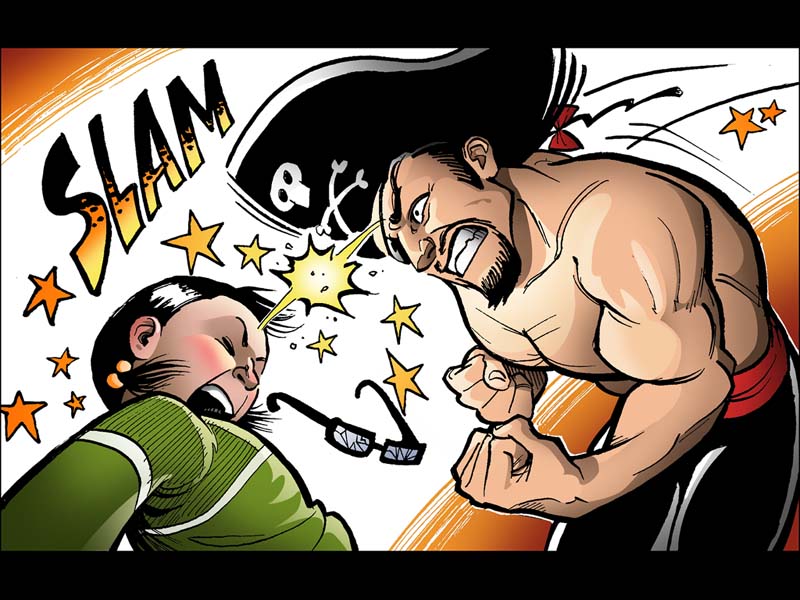 The comic is 38 pages long; unlike most shitty 22-page main stream comics out there, this is 38 pages of full content--NO ADS. The comic has glossy paper, full color front and back covers, black and white inside. Get some tissue paper ready, because here's a sample of the ball stompage you'll find within: